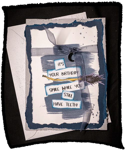 Grey speckled card stock teamed up with navy blue and splatters – all tied up with a Frizelda dangling moon.