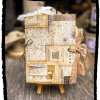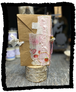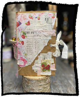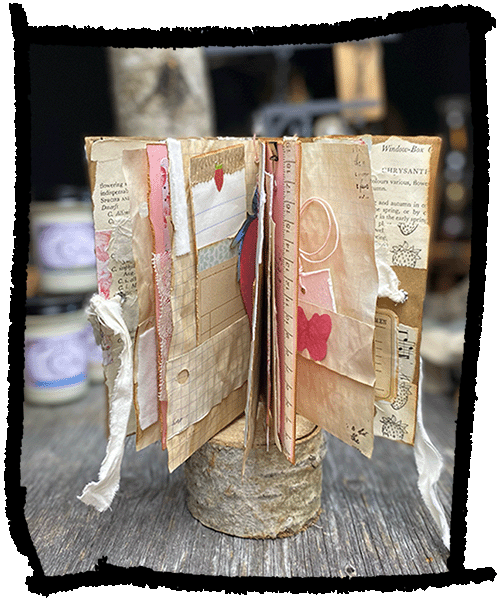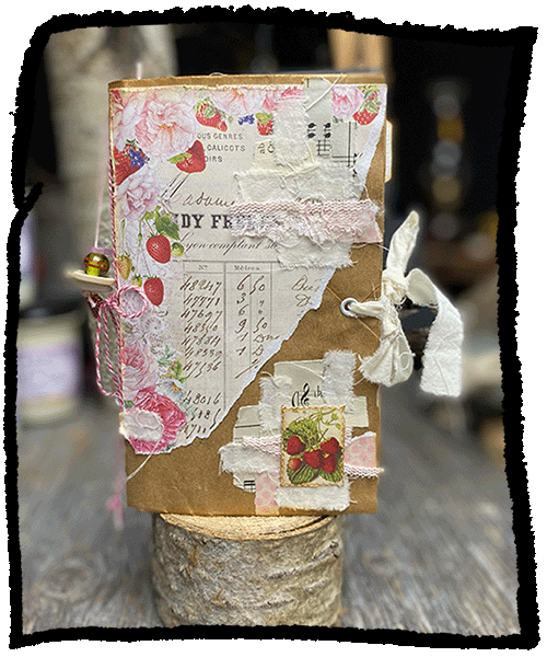 A lovely collection of strawberries, recycled music paper, old book pages and a recycled brown paper bag cover. Pamphlet stitched with white baker’s twine binding. Size: 4in wide x 7in tall.