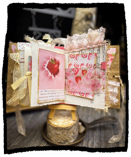 A lovely collection of strawberries, recycled music paper, old book pages and a recycled brown paper bag cover. Pamphlet stitch with pink baker’s twine binding.