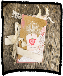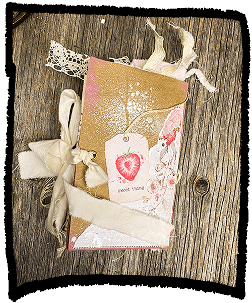 A lovely collection of strawberries, recycled music paper, old book pages and a recycled brown paper bag cover. Pamphlet stitched with white baker’s twine binding.